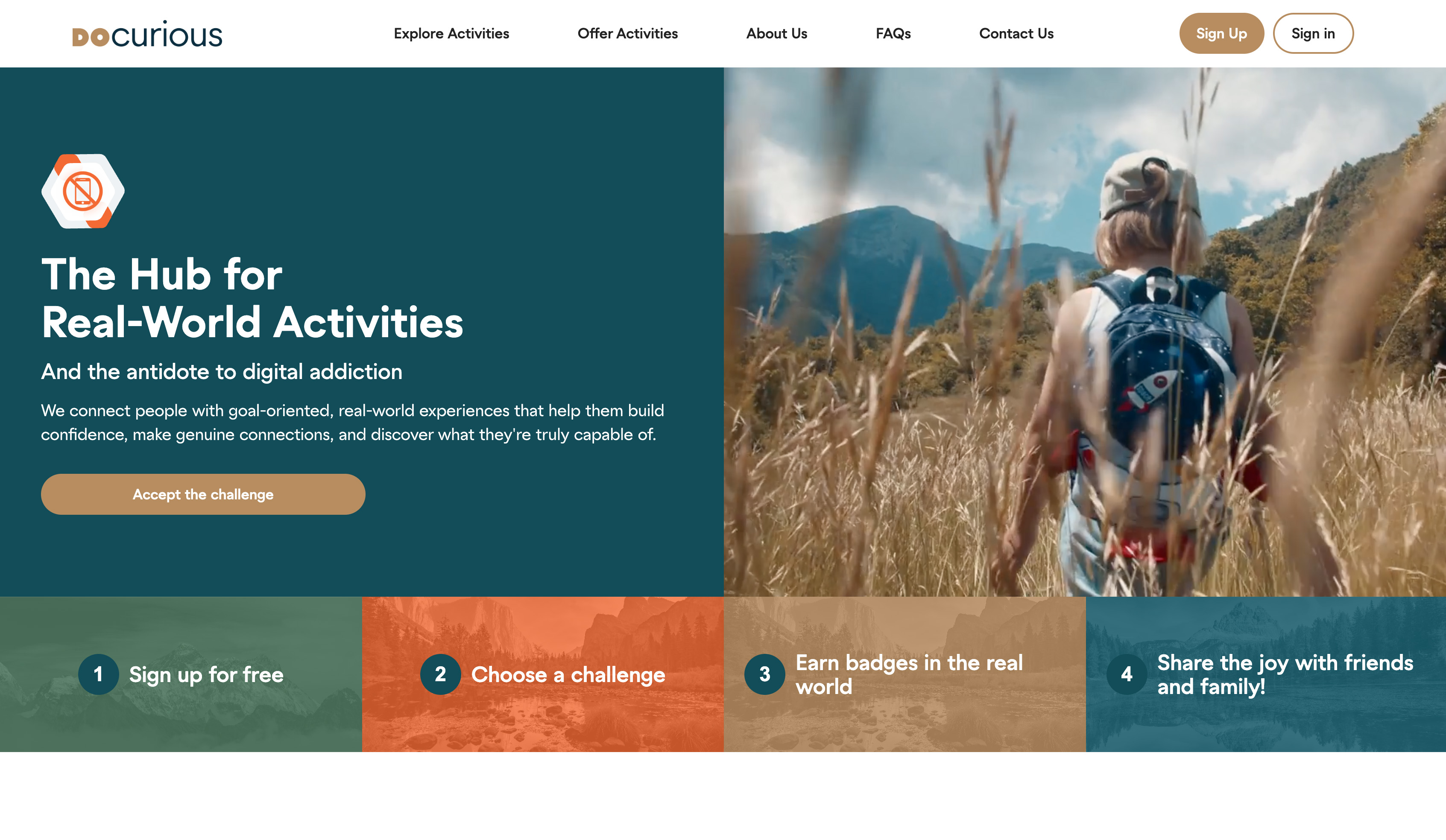 Screen‑free activities are real‑world activities done without cell phones or computers. What DoCurious does is similar, but better. (That’s the twist.) We specifically configure our library of screen-free, goal‑oriented activities as goal-oriented challenges. A goal-oriented challenge is an activity with a known mission or goal that is neither too easy nor too difficult for the skill set of the person undertaking it. Psychologists specializing in Positive Psychology (the science of what makes us believe that our lives are worth living and well-lived) have shown that these types of challenges can provide the key elements needed for health and happiness. These are the very elements that excessive screen time strips away. Our specially configured activities get you and/or your kids off devices and into new, real life exploits that can foster a sense of autonomy, competence, and connection.